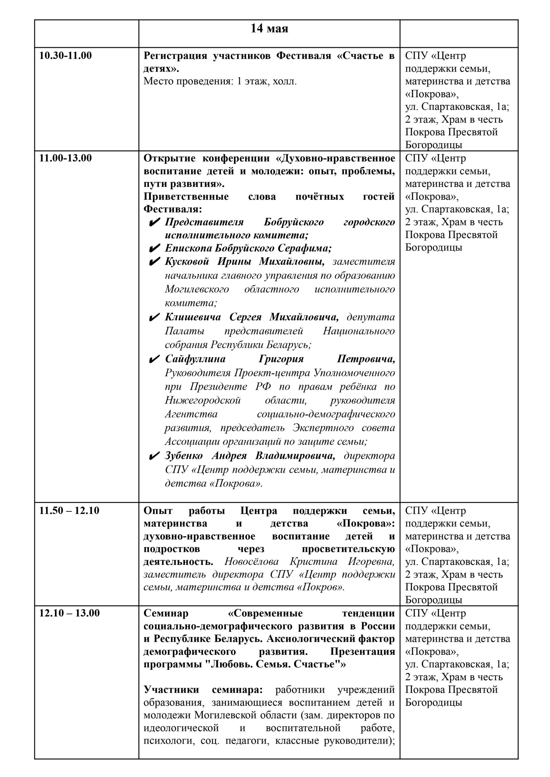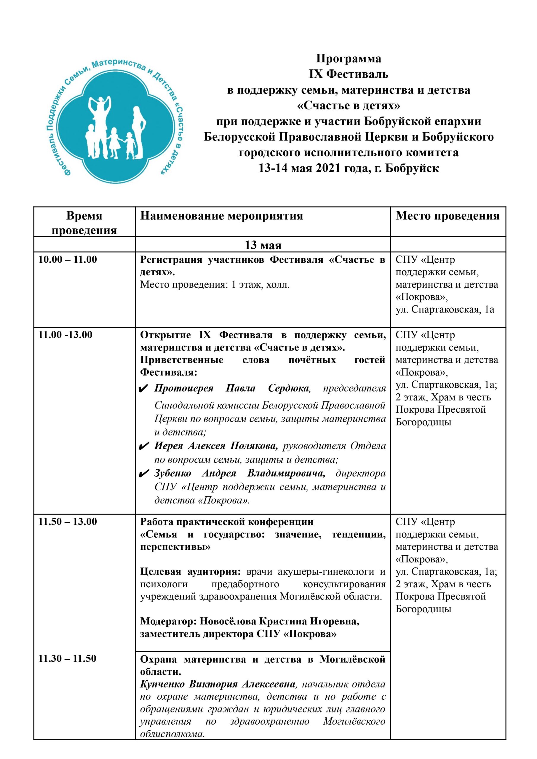 13-14 мая в Бобруйске пройдет IX Фестиваль в поддержку семьи, материнства и детства «Счастье в детях». Форум объединит представителей Белорусской Православной Церкви, государственных, социальных учреждений, сферы образования и здравоохранения из Беларуси и России, а также учащихся и студентов.