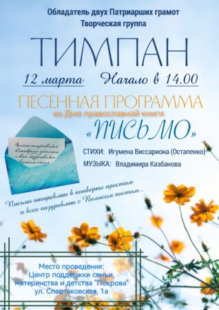 12 марта Центр «Покрова» в Бобруйске приглашает гостей и жителей города на великопостную программу «Письмо» творческой группы «Тимпан», приуроченную к Дню православной книги.