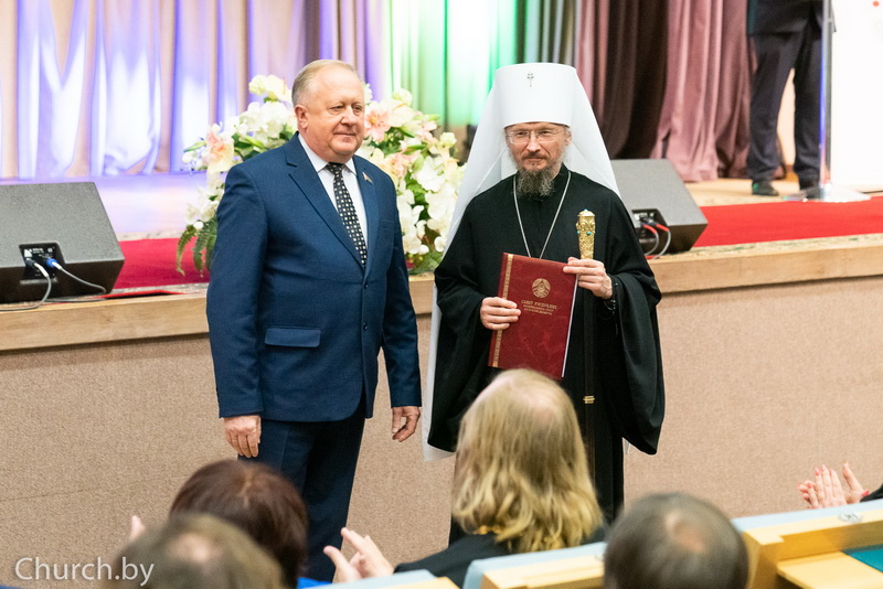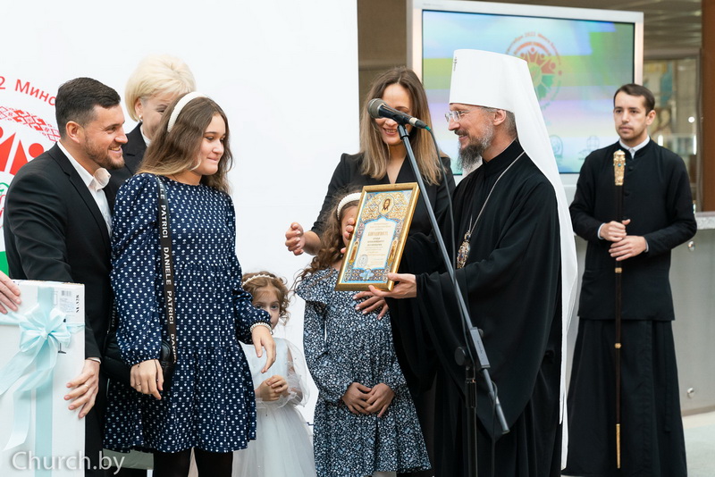 Затем по случаю празднования 1030-летия Православия на белорусских землях Митрополит Вениамин и Министр труда и социальной защиты Республики Беларусь Ирина Костевич отметили медалями и благодарностями Белорусской Православной Церкви, а также ценными подарками многодетные семьи.