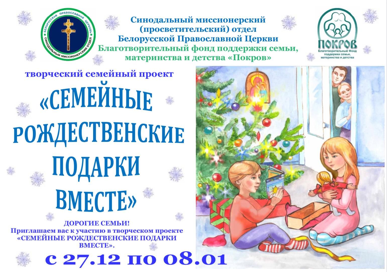 Синодальный миссионерский отдел Белорусской Православной Церкви и Благотворительный фонд поддержки семьи, материнства и детства «Покров» приглашают всех желающих поучаствовать в творческом проекте «Семейные рождественские подарки вместе».
