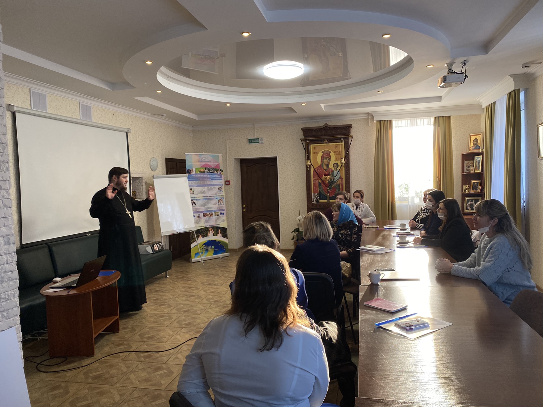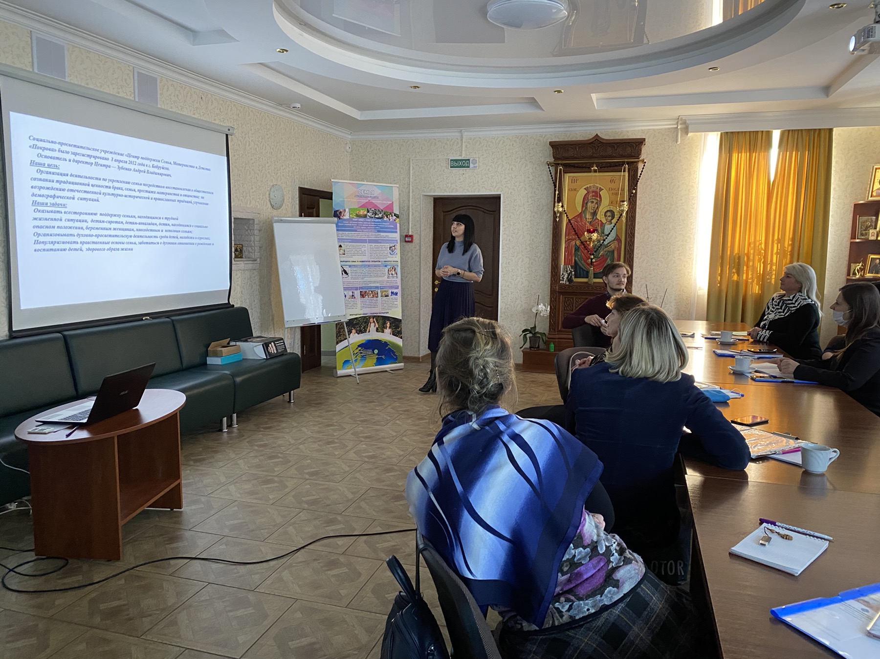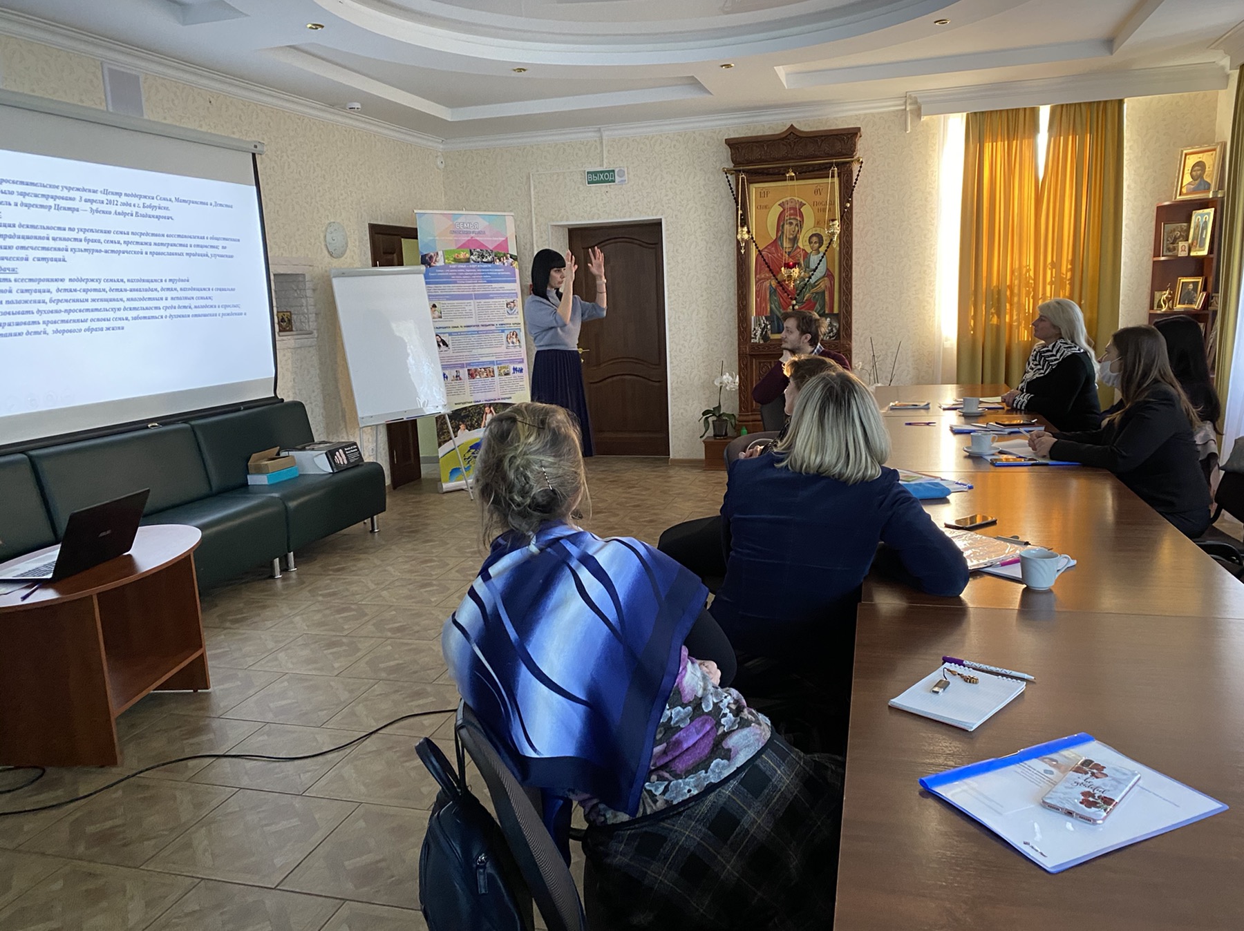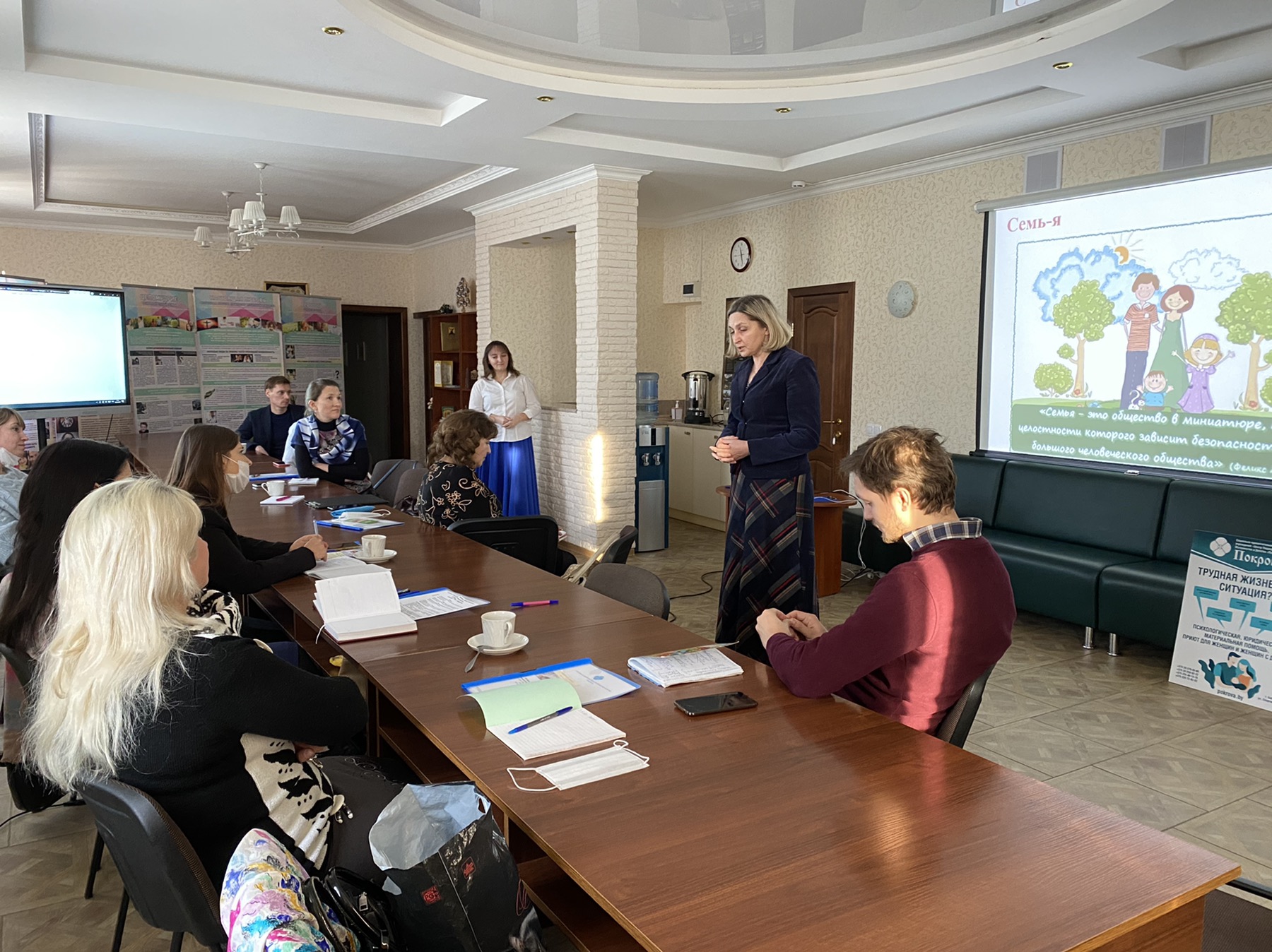 8 декабря 2020 года СПУ «Центр поддержки семьи, материнства и детства «Покрова» встретил гостей из городов Гомель и Полоцк. Активные, неравнодушные, инициативные педагоги встретились, чтобы поделиться опытом просветительской деятельности. Гостеприимно встретили гостей настоятель храма Покров Пресвятой Богородицы Бобруйской епархии иерей Алексий ПОЛЯКОВ, руководитель Центра ЗУБЕНКО Андрей Владимирович, которые провели обзорную экскурсию и пригласили в конференц-зал, где и прошла плодотворная встреча.