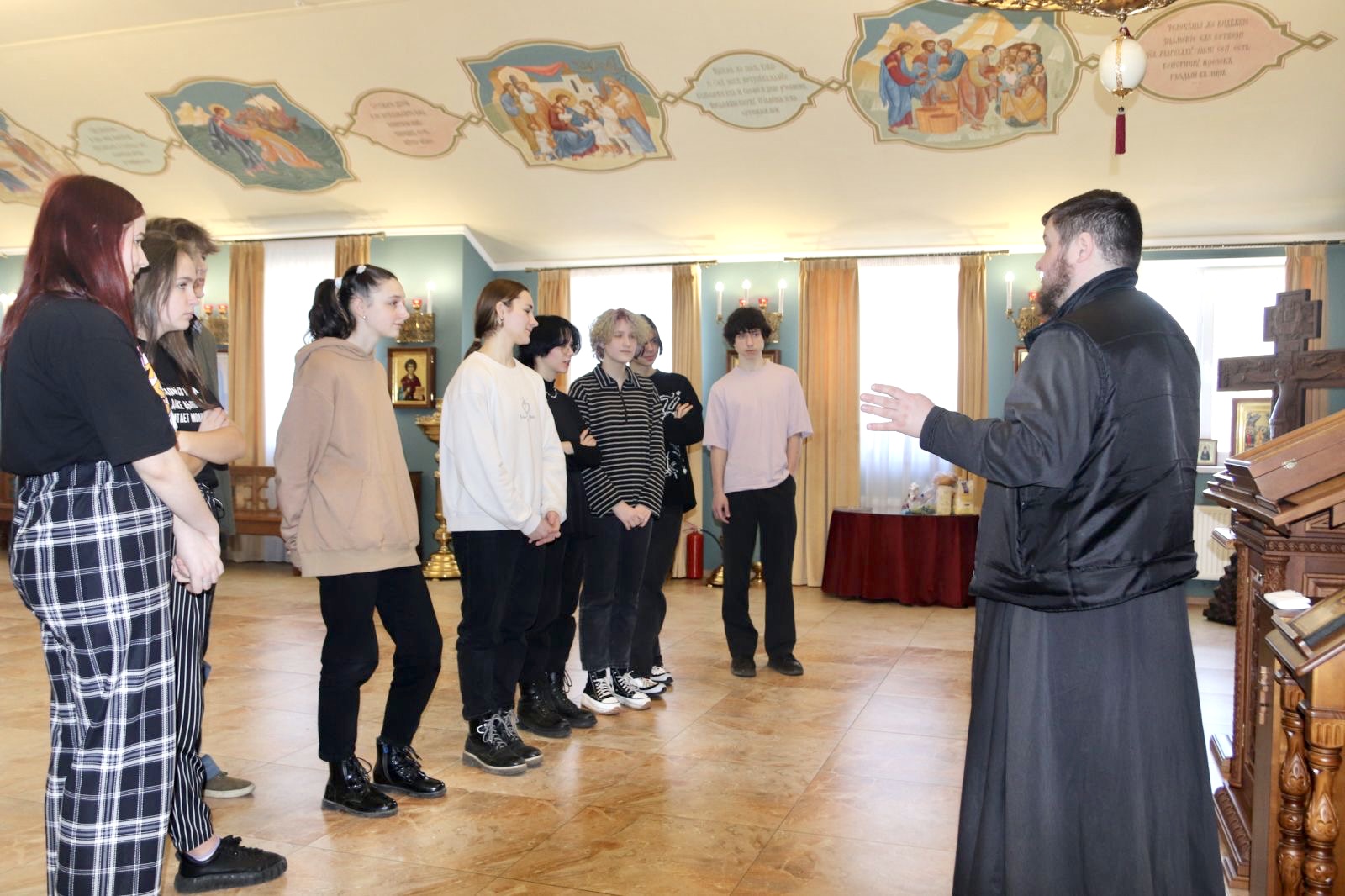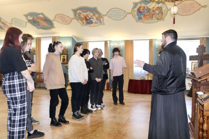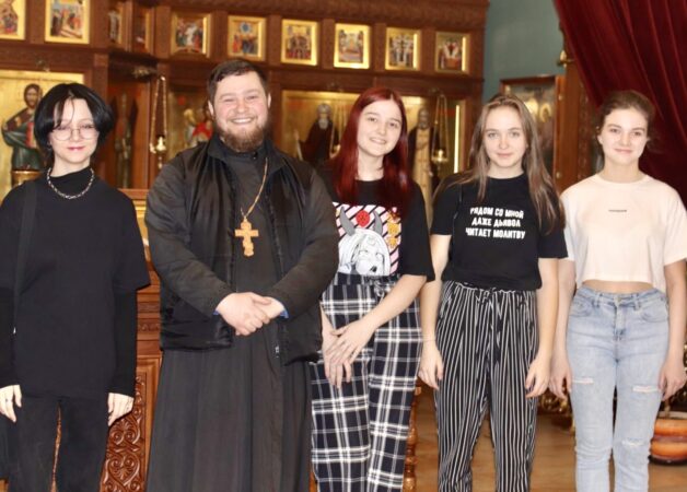 Встреча началась с общения с настоятелем Покровского храма иереем Алексеем Поляковым. Молодежь прошла в домовый храм, ознакомилась с его устройством и храмовыми иконами.