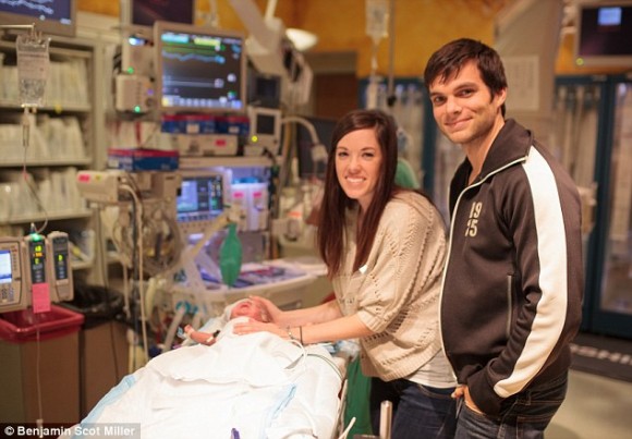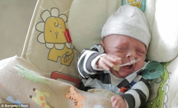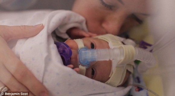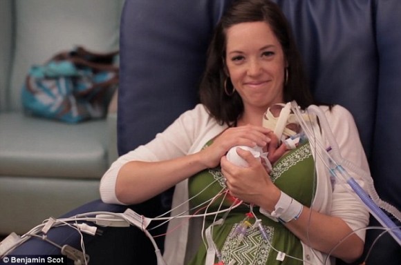 Первые 107 дней своей жизни малыш провел в отделении интенсивной терапии. С помощью медсестры, проводов и медицинского оборудования Линдси может держать сына на руках.