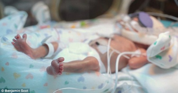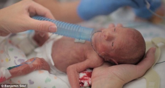 Мать Линдси держит своего сына в первый раз — через четыре дня после того как он родился на три с половиной месяца раньше срока.