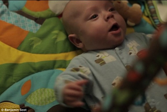 «В один такой тяжелый день мы были рядом. Малыш был без маски и без трубки. И вдруг он немного повернул голову и … улыбнулся! Мы знали, что он не может видеть на данном этапе, но то, что он открыл глаза и открыл их настолько широко, мы такого не видели раньше. Он смотрел прямо на нас! У меня было достаточно времени, чтобы сфотографировать его . Через некоторое время он закрыл глаза и немного повернул голову обратно к потолку. Я никогда не забуду тот момент. Я чувствую, как будто он говорил нам — Я в порядке! Не теряйте в меря веру!» Вот та фотография.