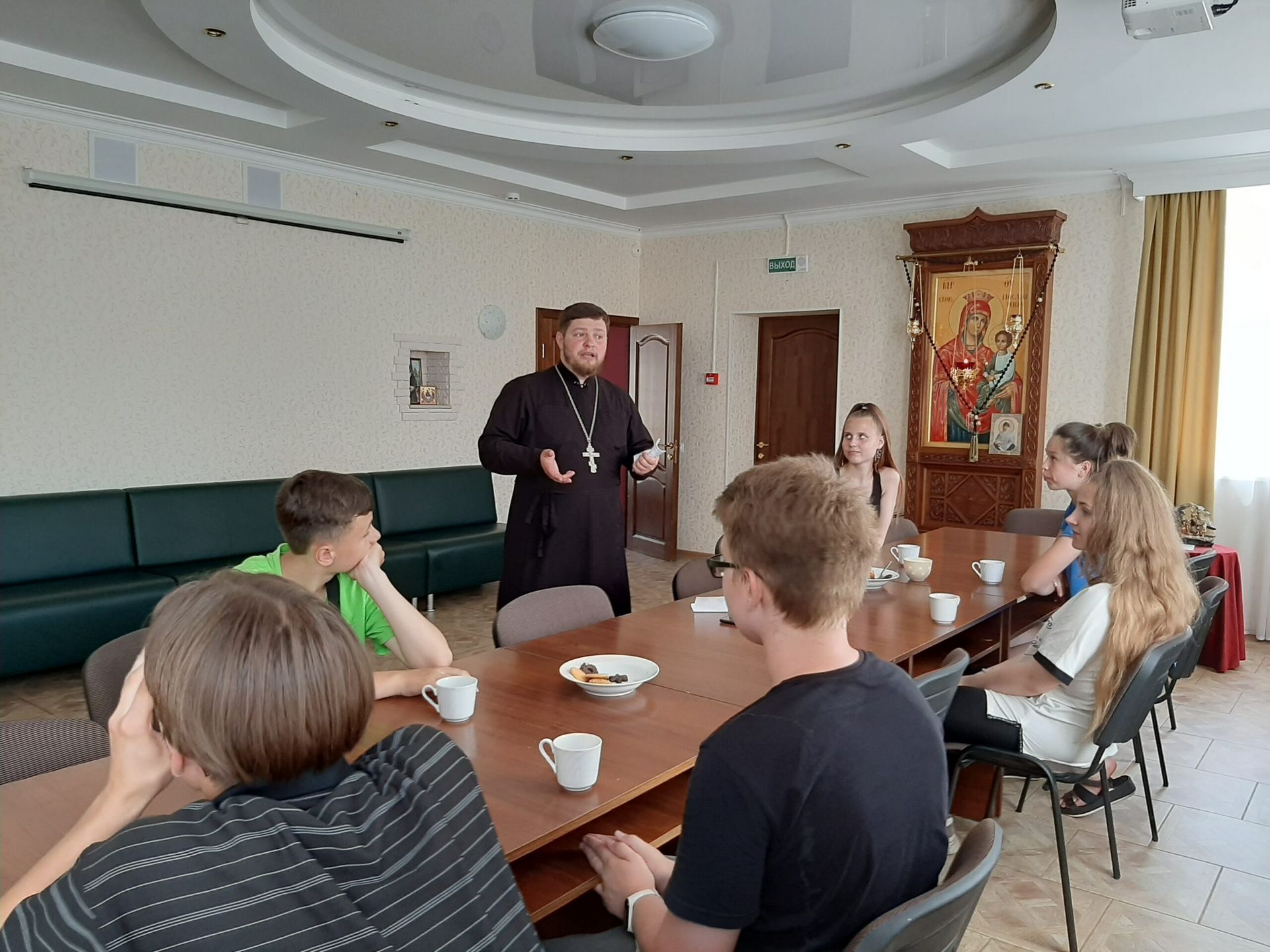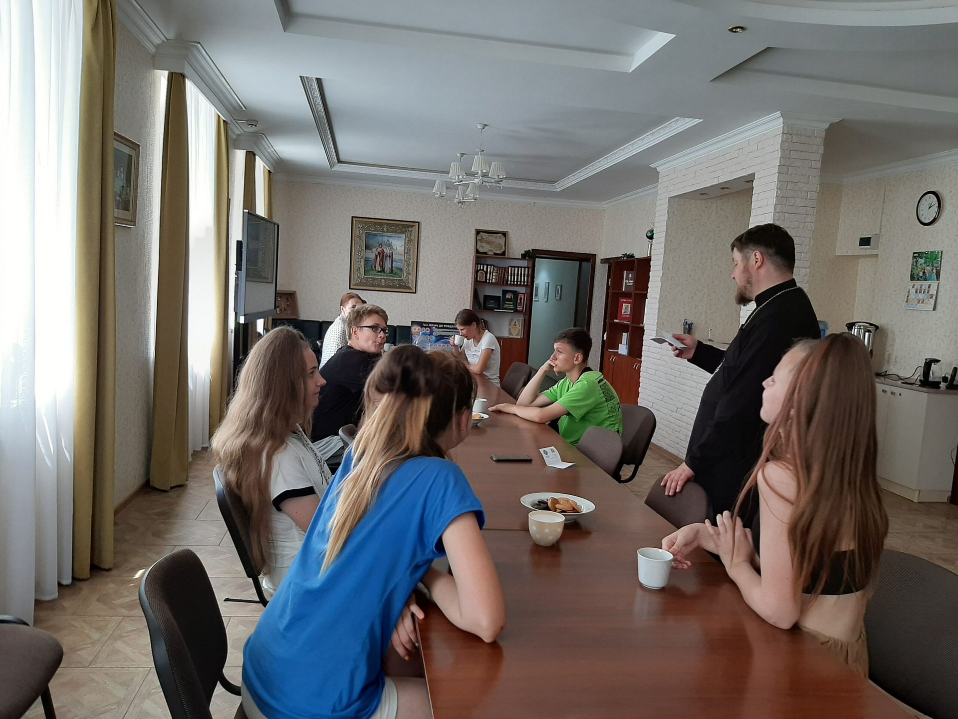 25 июня ребята старшего отряда Алые паруса, воспитанники лагеря труда и отдыха с дневным пребыванием Государственного учреждения образования «Средняя школа № 18 г. Бобруйска» снова встретились с настоятелем храма Покров Пресвятой Богородицы города Бобруйска иереем Алексием. Формат встречи Вопрос — Ответ. Ребят интересовали вопросы: