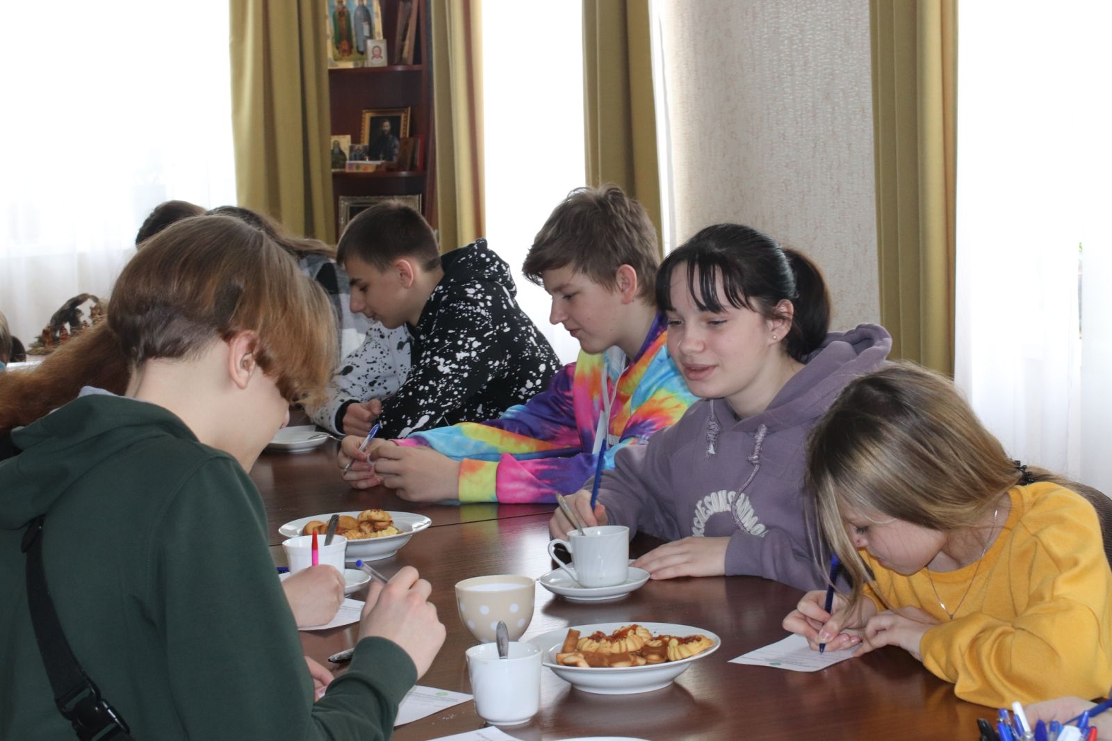 Недавно в гостях у Центра поддержки семьи, материнства и детства «Покрова» побывали учащиеся 8 класса СШ №32. Ребята совершили экскурсию по учреждению, познакомились с историей создания Центра, а также поиграли в интерактивную игру » Любовь. Семья. Счастье.» под руководством методиста Надежды Николаевны Поляковой. Особый интерес у гостей вызвало общение с настоятелем домового храма Покрова Пресвятой Богородицы иереем Алексием Поляковым.