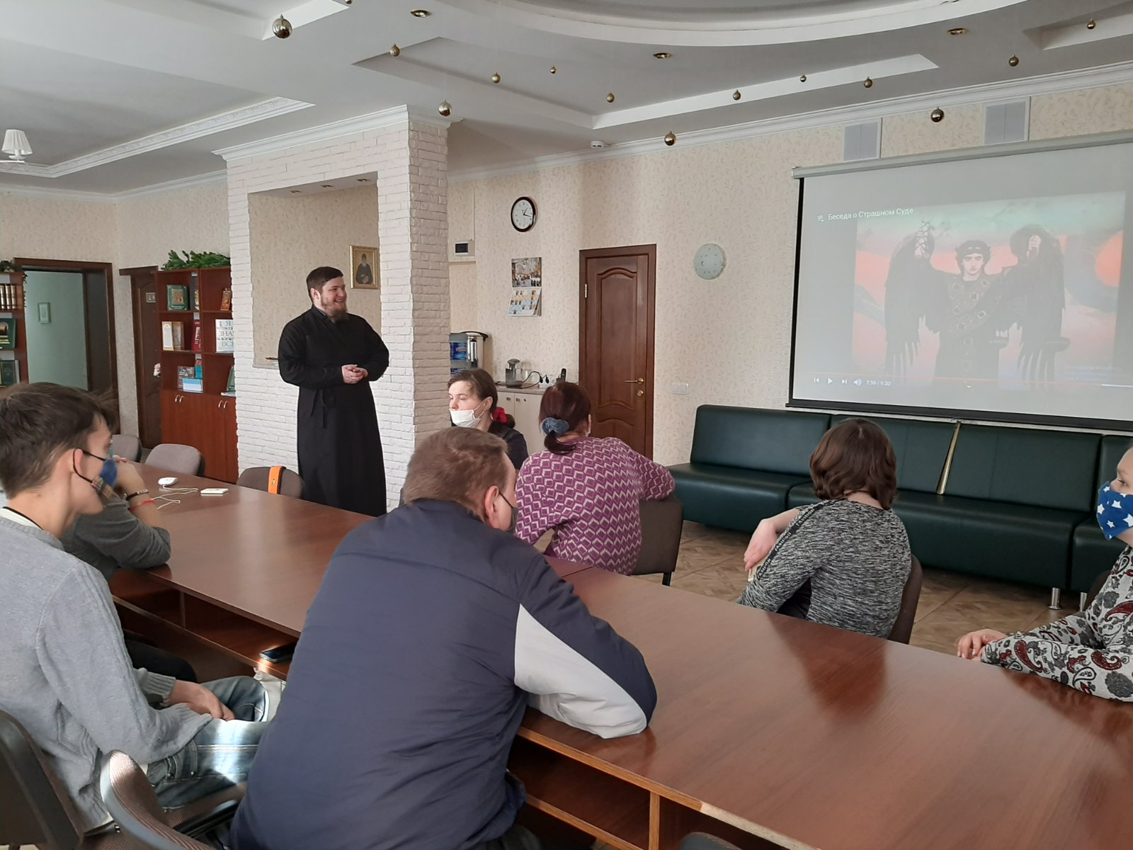 3 марта в Центр поддержки семьи, материнства и детства «Покрова» пришли дорогие гости — люди, чьи возможности и силы ограничены. Ребята из Ленинского и Первомайского ТЦСОНов в этот раз приняли участие в духоно-нравственной беседе с отцом Алексеем Поляковым. Тема занятия — Неделя о Страшном суде. Участники задавали вопросы, активно обсуждали просмотренный фильм. Далее программу пребывания гостей продолжили спортивные занятия, которые провел с ребятами тренер Валерий Алексеев. По завершении мероприятия матушка Надежда организовала для всех дружеское общение за сладким столом.