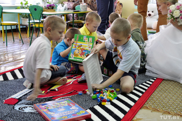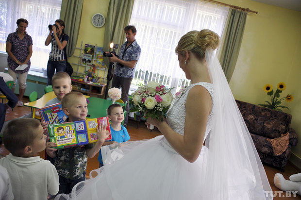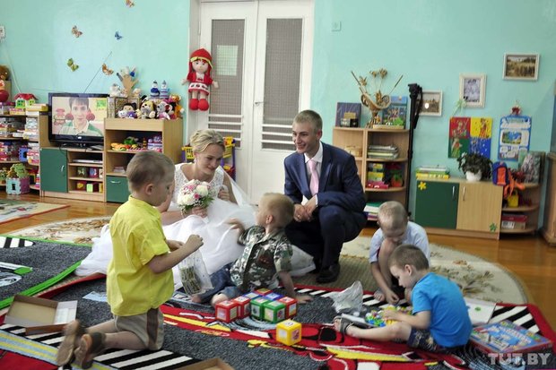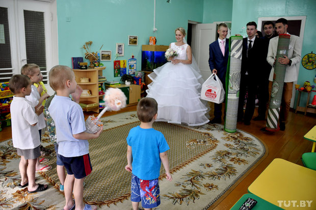 Тем временем педагоги уже рассказали детям, что скоро сюда приедет невеста и жених в свадебных нарядах. Подобные акции были в центре и раньше, но игрушки детям привозили уже после свадьбы. А такого, чтобы приехали в свадебных нарядах, за 15 лет здесь не припомнят.