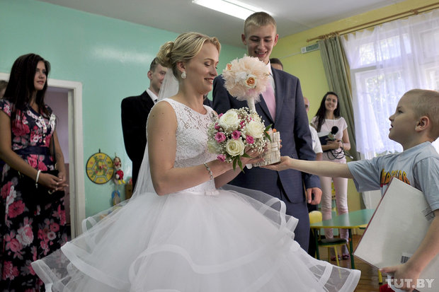 Перед свадьбой Ефим и Александра, студенты Белорусского торгово-экономического университета потребкооперации, попросили гостей не тратиться на цветы, чтобы на эти деньги можно было купить подарки для детей из неблагополучных семей, которые вынуждены находиться в приюте.