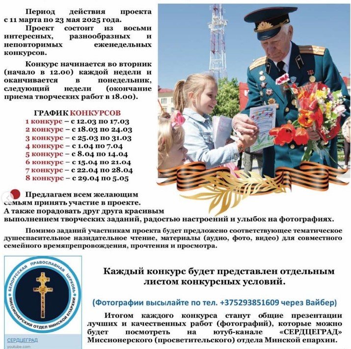 В преддверии Великого праздника — 80-летия Великой Победы — Синодальный миссионерский отдел Белорусской Православной Церкви и Благотворительный фонд поддержки семьи, материнства и детства «Покров» приглашают к участию традиционном творческом семейном конкурсе «Празднование 80-летия Великой Победы ВМЕСТЕ. Память на века».
