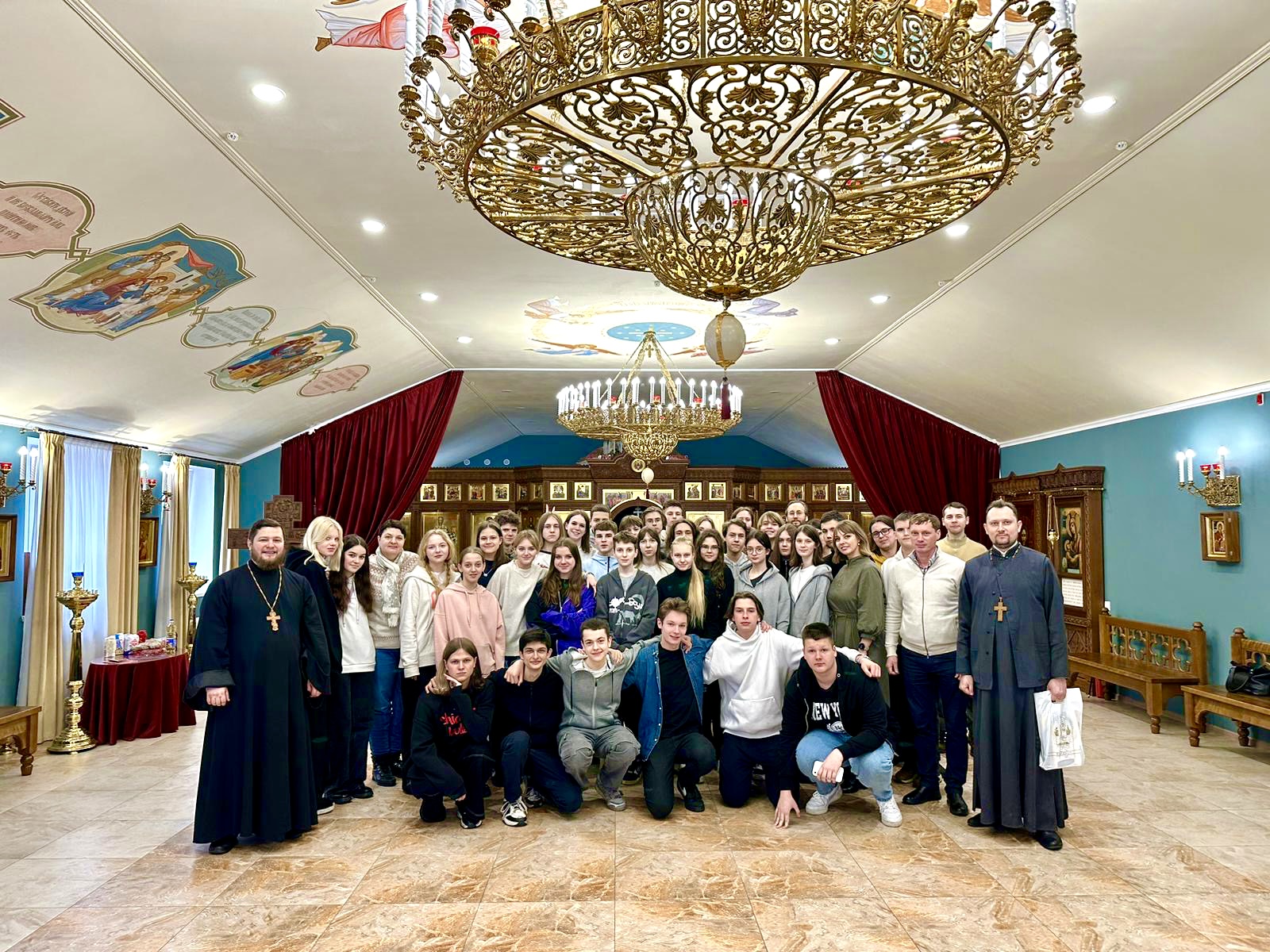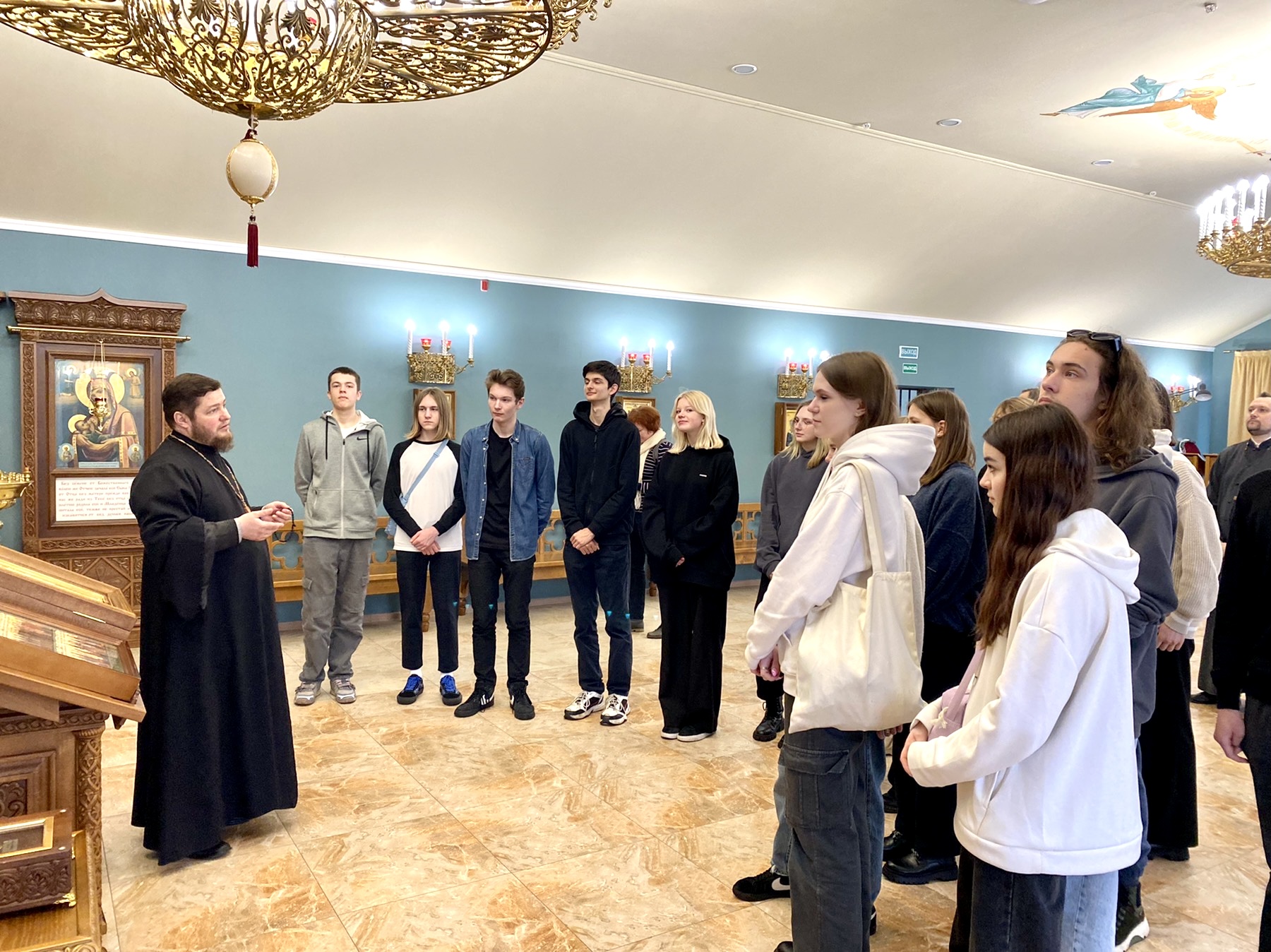 Экскурсия продолжилась посещением Покровского домового храма. Радушно пригласил гостей пройти в храм настоятель иерей Алексей Поляков. Отец Алексей сразу нашел общий язык с молодежью, рассказал об устройстве храма, ответил на вопросы.