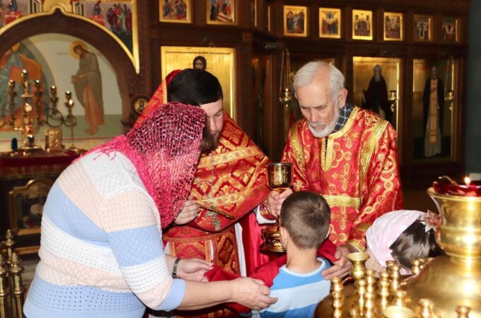 По завершении богослужения настоятель храма иерей Алексей Поляков поздравил причастников и благословил детей.