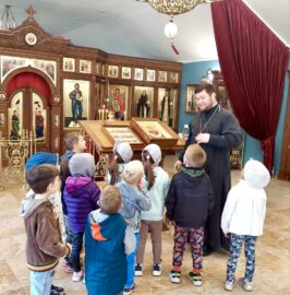 Батюшка провел для гостей увлекательную экскурсию, рассказал детям как нужно вести себя в храме, как молиться: складывать пальчики и что это означает. Дети узнали об иконах и кто на них изображён, о том, зачем ставить свечи и об их значении.